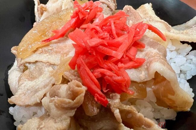 さて、出来上がりを見ると、ご飯の上に牛バラ肉と玉ねぎ、そして大量の紅生姜が盛られた丼です。この見た目からすると、いわゆる「牛丼」です。面白いのは、最初から紅生姜がたっぷり盛られていること。牛丼の上が真っ赤になるほど紅生姜を乗せるのが好きなので、これはラッキーだと思いましたが、好き嫌いもあるので「思い切っているな」とも感じました。