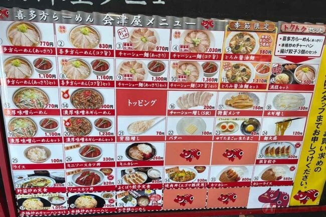 これまで何度も利用してきたので、ここでいただく喜多方ラーメンの美味しさはよく分かっていますが、以前から気になっていたのが店内入口にある大きなメニューボードです。ほとんどがラーメンやセット、トッピングですが、下の方にラーメン以外のメニューも並んでいるのです。