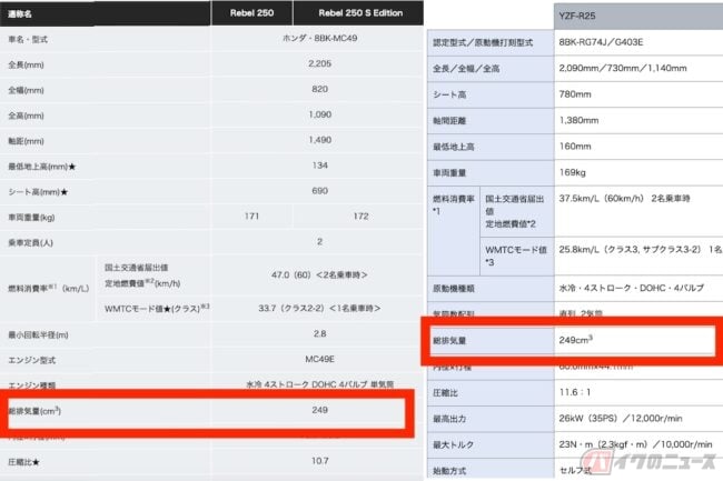 しかし、名前についている数字と実際の排気量が全く同じであるケースは、実はほとんどありません。先述のレブル250やYZF-R25の諸元表を見てみると、排気量の欄には249ccと書かれています。