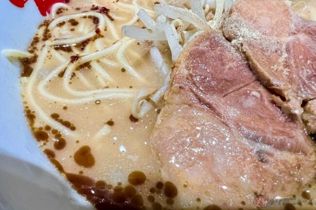 出来上がりをいただいてみると、意外にもスープの味わいはあっさりしています。後日「なんつッ亭」のホームページを見ると、「豚骨スープ特有の臭みが抜け、見た目の濃厚さとは裏腹の上品な風味になっています」と書かれていました。豚骨と鶏ガラの旨味が豊富で、時間をかけて作り出したスープは脂分が乳化し、クリーミーになっているようです。