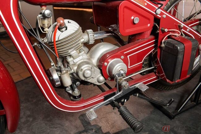 エンジンは「C型」の発展型と言われていますが、排気管の出口が前方から後方へ変更されています。片持ちだったクランクケースは両側で保持され、一体型の2速ミッションが追加されてバイクのエンジンとしてふさわしい外観になっています。