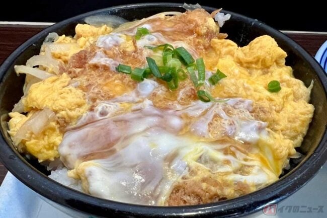 続いて「かつ丼」をいただきます。出来上がりを待つ間に店内を見ていたら、様々な丼メニューが販売されていたので、これもその一環ということでしょう。ボリュームは抜群。ふわっとした玉子と分厚いカツで、見た目はとても美味そうです。