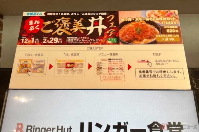 ここのフードコートは「リンガー食堂」(営業時間:7時~20時)として営業していますが、食券の購入方法がやや複雑です。タッチパネルで「店内」→「丼」→「メニュー」の順で選択して購入できたのですが、「ご購入STEP」と記載された解説を見ないと難しそうです。