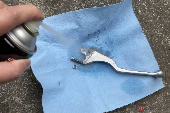 とは言え、金属パーツであってもバイクに装着されている状態でパーツクリーナーを吹きかけると、周囲の樹脂パーツや塗装パーツにもパーツクリーナーが付着する危険があります。したがって前述したブレーキ清掃のように、ウエスやペーパータオルに吹いたうえで拭うか、分解して金属パーツのみにした状態で吹き付けると安心です。