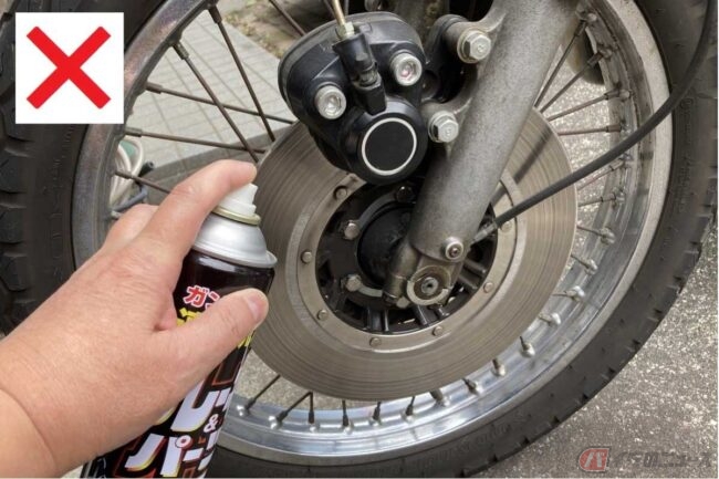 「ブレーキ&パーツクリーナー」という製品名も多いので、当然ブレーキまわりの清掃に使えると考えますが、コレも注意が必要です。とくにブレーキキャリパー周りに直接吹きかけると、ブレーキパッドにパーツクリーナーの成分が浸透する場合があり、それが原因でブレーキの効きが悪くなる可能性があります。