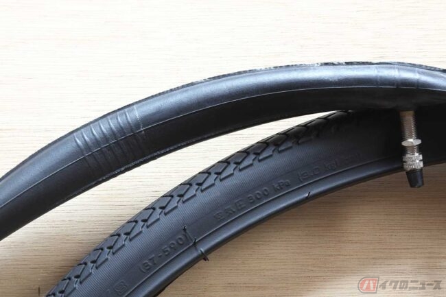 また、自転車のタイヤにはクルマやバイクのように、タイヤがすり減ると浮き上がって交換タイミングを教えてくれる「スリップサイン」はありませんが、表面の溝の深さが1.6mm以下になったら交換した方が良いと言われています。そちらも参考になると思います。