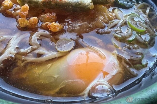 かき揚げはインゲンが3本も入っており、つゆに浸された状態でしっとりとした食感を楽しむことができました。とくに際立った美味しさはありませんが、食べ応えがあり、月見そばとしての楽しみもありました。