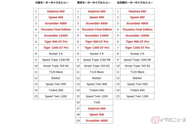 トライアンフモーターサイクルズジャパンは、2024年の大阪・東京・名古屋モーターサイクルショー出展概要を発表しました。
