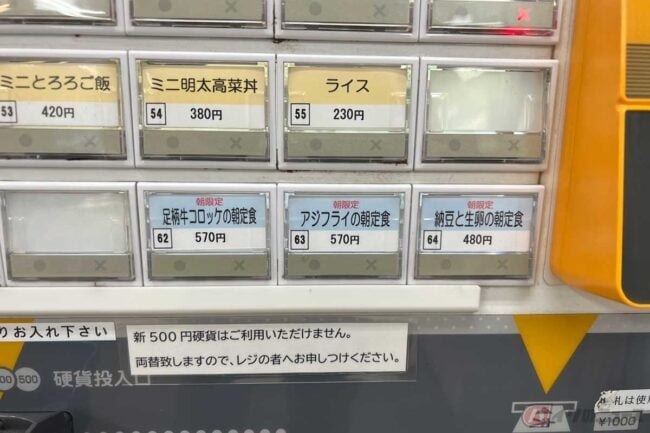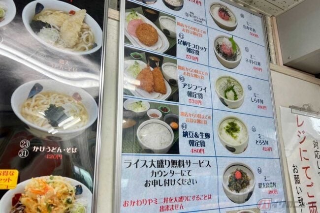 メニューを見ると、朝限定の「朝定食」がありました。「アジフライ朝定食」(570円)や「納豆&生卵朝定食」(480円)、そして今回オーダーした「足柄牛コロッケ朝定食」(570円)です。ちなみにライスは大盛り無料サービス中でしたが、普通盛りにしました。