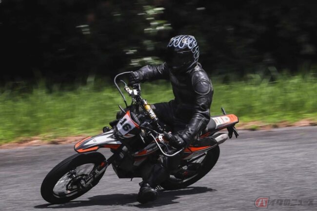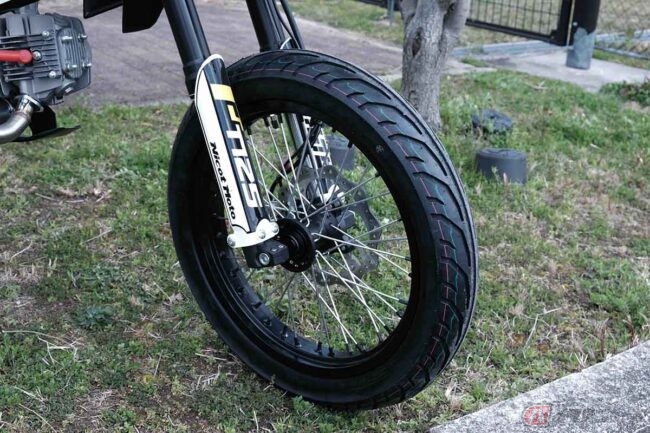 新たに登場したモタードホイールセットには17インチのフルサイズ仕様と、足付きもよくなり小回りも効く14インチ仕様の2タイプが用意されており、ブレーキローター、スプロケ、タイヤが装備されているため既存のホイールと入れ替えるだけでモタード仕様へと変更可能。