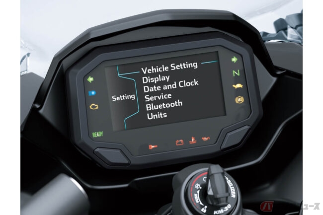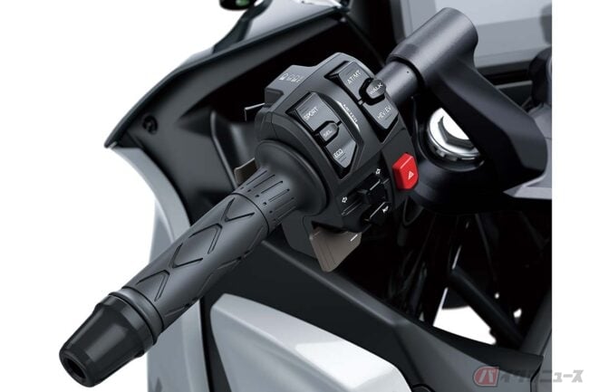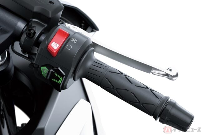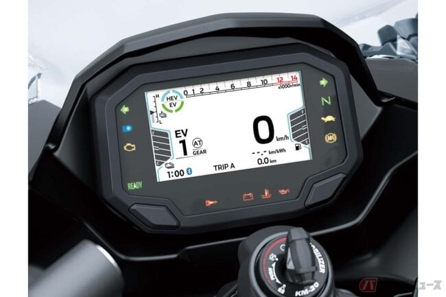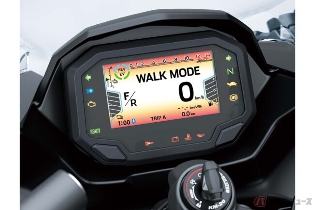 また、Ninja 7 Hybridでは燃料の節約と排出ガスの低減を図るため、停止時に内燃エンジンが停止するアイドリングストップや、停止時に自動的に1速ギアを選択するALPF(オートマチック・ローンチ・ポジション・ファインダー)、低速での操作や駐車をサポートする前後進の「ウォークモード」なども採用。