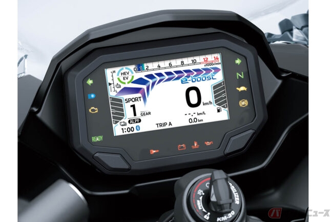 600ccクラスのサイズ感でありながら、カワサキのEVですでに採用されている「e-boost」機能を搭載することで1000ccクラスのスーパースポーツモデルに匹敵する発進加速性能を可能にしたNinja 7 Hybridでは、エンジンとモーターのポテンシャルをフルに引き出す「SPORT-HYBRID」、トラクションモーターで発進、EVからHEV(Hybrid Electric Vehicle)へシームレスに移行し高い燃費性能を実現する「ECO-HYBRID」、静粛で低振動、かつゼロエミッションの低速・近距離用モード「EV」の3つのライディングモードに切り替え可能。