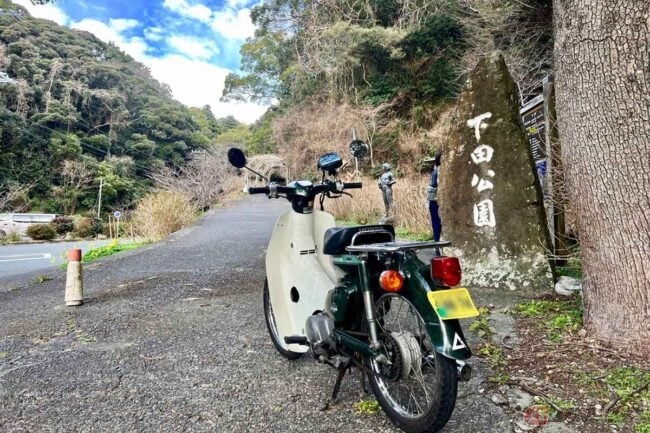 伊豆半島の下田と言えば、ペリー来航と開国の地として有名ですが、戦国時代は北条氏と豊臣秀吉率いる大軍との戦の舞台にもなりました。結果、豊臣が数で圧倒しましたが、北条の築城技術は高く、その痕跡はいまでも間近に見ることができるのです。スーパーカブで「下田城跡」を訪れました。