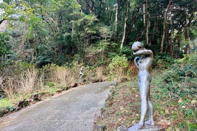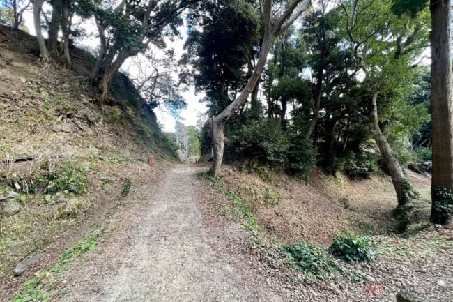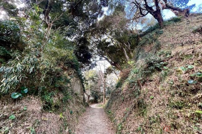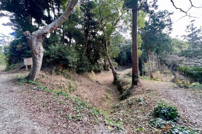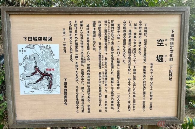 現在の「下田城」は、1901年(明治34年)以降「下田公園」として開放されています。入り口から登っていくと視界に入るのが、見事な空堀(からぼり)です。現地に設置された解説板によると、約700mもの長大な空堀が巡らされていたようです。