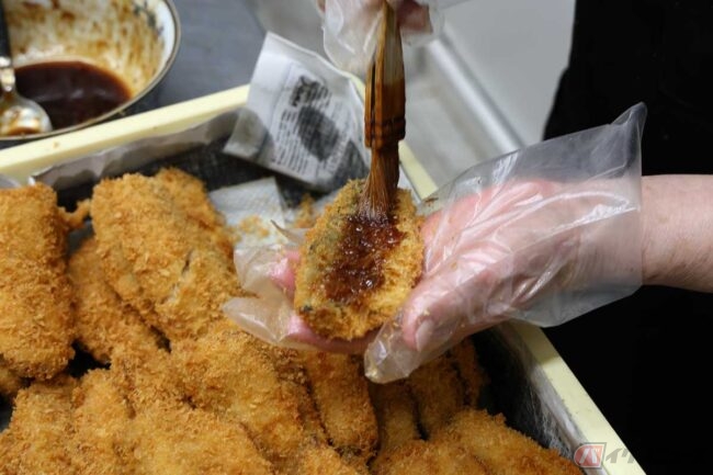 店主の和田さんにアジフライサンドを料理中の厨房に案内してもらいました。生のアジの半身を揚げたアジフライにソースを塗り、自家製のタルタルやレタスと一緒に食パンに挟んでいます。1.5尾分の3枚のアジフライと、たっぷりのタルタルでかなりボリュームのあるサンドイッチです。