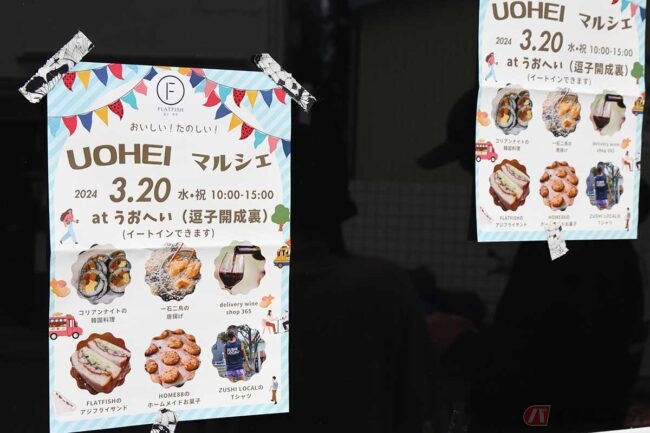 韓国料理の「コリアンナイト」、ワインの「DELIVERY WINE SHOP 365」、逗子駅近くの唐揚げが美味しい「一石二鳥」、ホームメイドお菓子の「HOME88」、Tシャツの「ZUSHI LOCAL」、そして「うおへい商店」のサンドイッチ部門「FLAT FISH」の6店舗が出店しています。