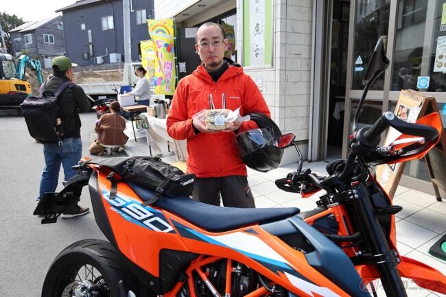 店に戻って「アジフライサンド」を購入します。どこで食べようかなぁと思ったところでライダーが続々来店し、「アジフライサンド」を購入していきます。