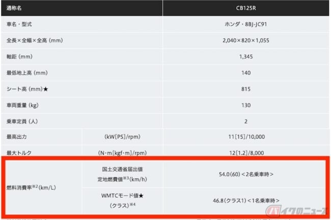 同じようにCB125Rの例で見てみると、WMTCモードで測定された値は46.8km/Lと、実燃費とほとんど変わらない数値となっています。