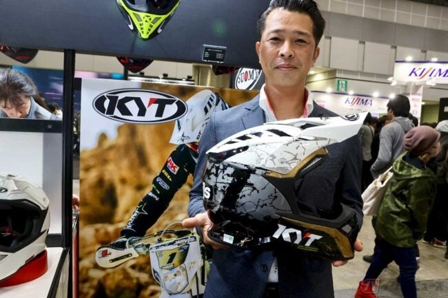「世界一過酷なエンデューロ」として知られる「エルズベルグロデオ」に参戦した藤原慎也選手のGASGASレーサーも見られましたし、そのエルズベルグロデオで度々優勝しているハードエンデューロ界のレジェンド、グラハム・ジャービス選手が愛用しているKYTヘルメットも、KYTジャパンとしてブースを出展していました。