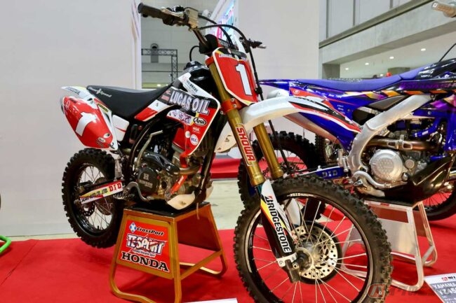 また、MFJ(日本モーターサイクルスポーツ協会)のブースでは、毎年、前年度のチャンピオンマシンが展示されます。今年は、全日本モトクロス選手権用のマシンに関しては4台の展示を確認できました。
