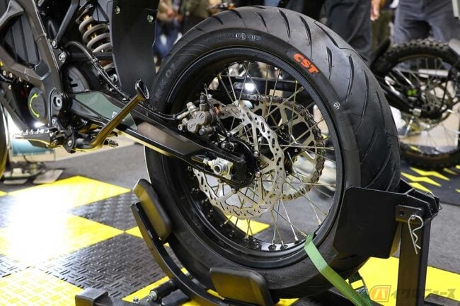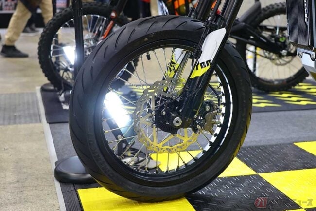 「モタードホイールキット」は全モデルに設定されており、出展者の1人は「注目度高いですよ! ストーム・ビーのモタード仕様で街中を走っていると、この姿でシューッと静かな音ですから」と笑顔で話します。
