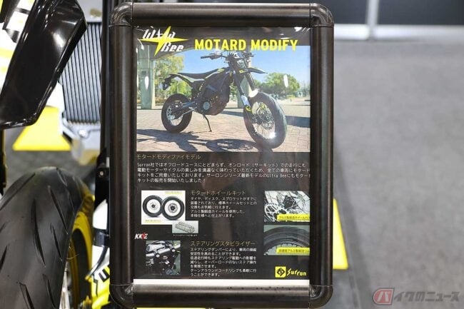 ブースには全3モデルが並べられていましたが、「ウルトラ・ビー」には前後17インチのワイヤースポークホイールにオンロードタイヤが装着され、「モタード・モディファイ」と称して「モタードホイールキット」の販売にも積極的な展示内容となっていました。