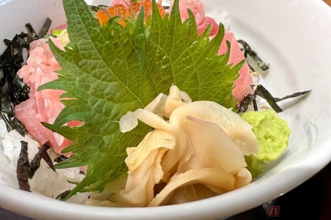 まずはわさびを小皿に移し、醤油で溶いて丼にかけていただきました。しかし新鮮なまぐろの刺身は醤油をつけなくてもイケる美味しさです。