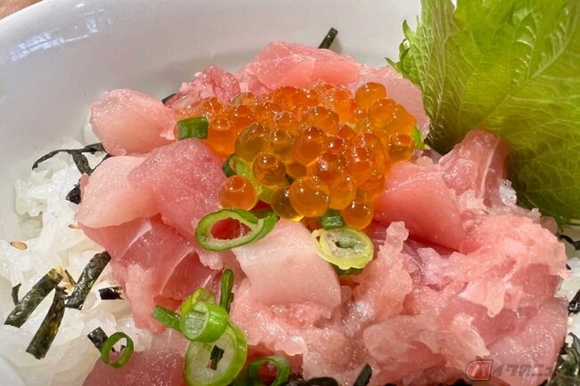 今回オーダーしたのは、これぞまさに海鮮丼! という「まぐろ・ネギトロ・ビントロ・いくら丼定食」(1300円)です。しつこいようですが「まぐろ、ネギトロ、ビントロ、いくら」です。王道の海鮮ネタが盛られているのです。全てのネタをメニュー名に掲げたい気持ちも分かる気がします。