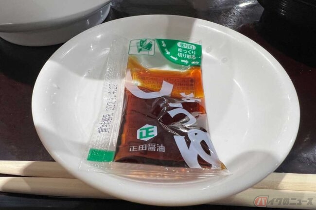 酢飯には海苔とゴマが振りかけられていて、そこに海鮮具材が盛りつけられ、わさびとガリが添えられています。受け取りカウンターで小袋のパック醤油を使う分だけ取っていくスタイルでした。