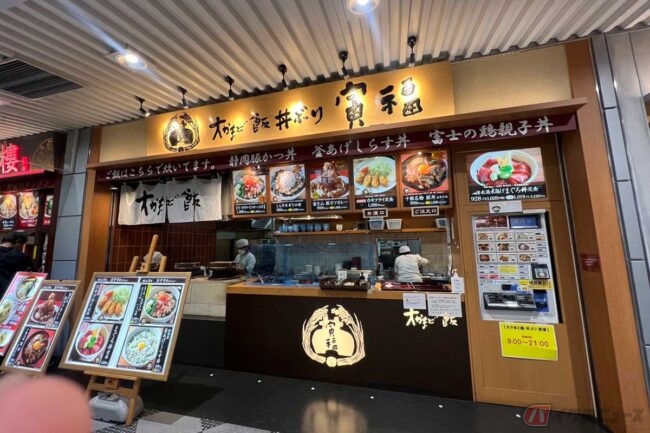 以前、ここで「富士山 唐揚げ定食」を食べたことがあり、巨大な唐揚げに驚いた記憶があります。丼ぶり専門店なのかと思いきや、「富士山豚カツカレー」(960円)や「カキフライ定食」(1200円)などのメニューもあります。