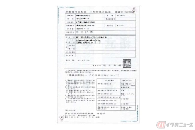 まず排気量が125ccまでの第一種/第二種原動機付自転車(いわゆる原付1種と2種)の場合は「原動機付自転車・小型特殊自動車 標識交付証明書」になり、ナンバーを取得する際に市区町村の役所で発行してもらいます。
