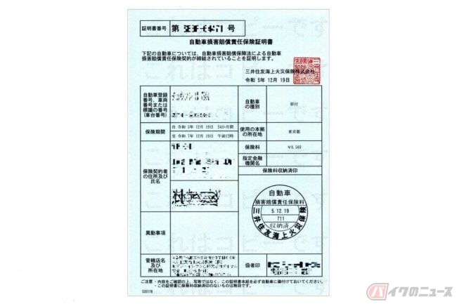 そして原動機付自転車から小型二輪まで、車両区分に関わらず、バイクに乗る上で絶対に加入が必要なのが「自動車損害賠償責任保険」です。そして運転時には「自動車損害賠償責任保険証明書」の携帯も法的義務があり(コピー不可、原本を携帯)、こちらが不携帯だと30万円以下の罰金が科せられる可能性があります。