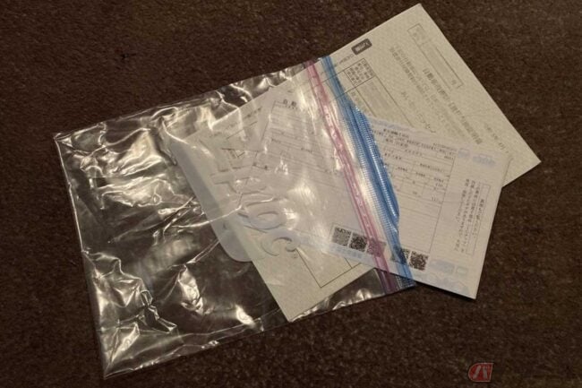 ちなみに自賠責加入時にもらえるビニールの「自賠責保険証明書入れ」はファスナー付きですが、なぜか穴が開いている(空気抜き? ヒモを通す?)場合があるので密閉性はありません。