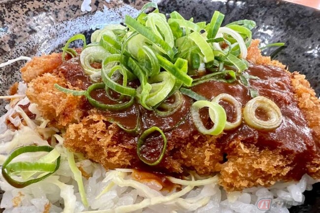 出来上がってきた「デミカツ丼」は、ご飯の上にキャベツの千切り、とんかつ、デミグラスソース、そして刻みネギのレイヤーです。店によってはグリーンピースを添えたりもするようです。