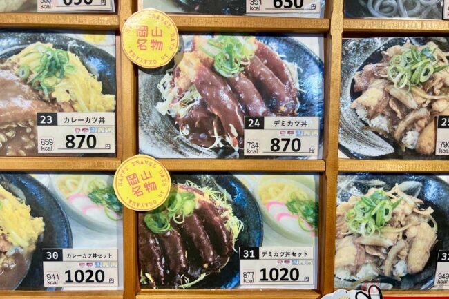 中国自動車道をバイクで移動中に立ち寄った「大佐(おおさ)SA」(下り)のフードコートで、視界に飛び込んできた「岡山名物」の文字が気になり、「デミカツ丼」という聞いたことがないメニューをオーダーしてみました。