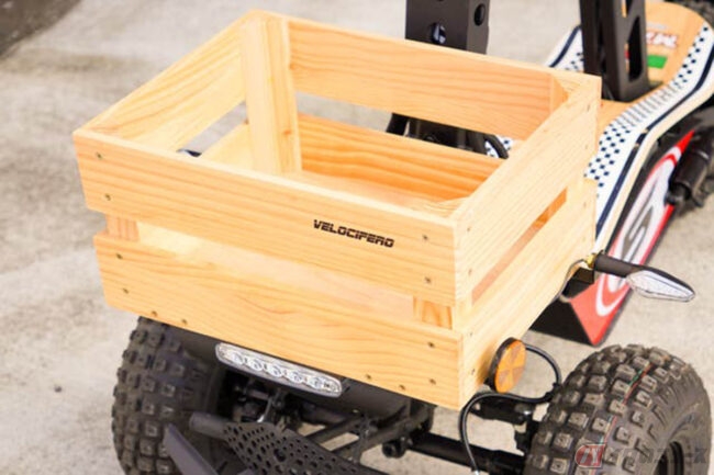 2000Wのモーターと60V/20Aのリチウムバッテリーを搭載するMAD-TRUCKは、3箇所のヘッドライトとウインカーなどを備えることでナンバー取得・公道走行も可能で、大容量のカーゴを備えることで十分な荷物を積載することができます。