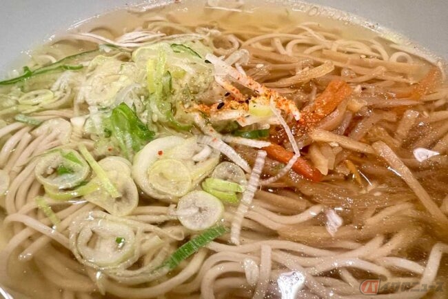 これって関西風、ってコト? 夜の東名高速「港北PA」で薄口のそばとそぼろ飯を バイクで行く高速道路グルメ