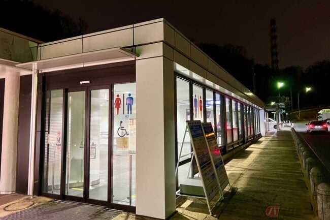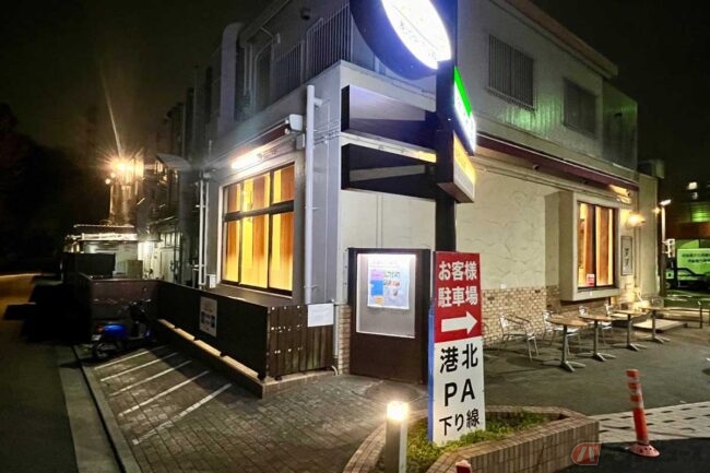 東名高速道路「港北PA」(下り)のフードコートでは、手軽に食事を済ませることができので、よくバイクで立ち寄ります。この施設は「ぷらっとパーク」としても運用されており、今回は夜に一般道からアクセスしてみました。クルマの駐車場は2台分と狭いものの、バイクや自転車が置けるスペースが用意されています。