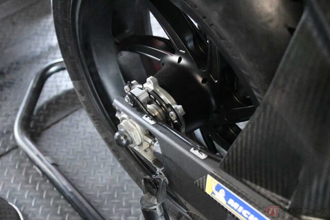 電動レーサー「V21L」が備える内燃エンジンのバイクとの違いは、まだあります。特徴的なものは、リアの「電気ブレーキ」です。ブレーキディスクやキャリパーは無く、ブレーキをかけると減速して、エネルギーがバッテリーに回生します。これはドゥカティ独自のブレーキシステムです。