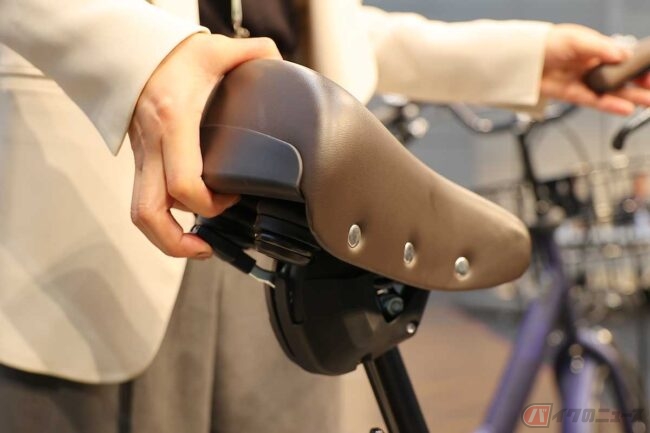 機能の操作は乗車中に作動しないよう、サドルを前方へ傾ける機構となっています(サドル傾斜センサー搭載)。ハンドルを握って自転車の横に立った状態でハンドル左手の液晶スイッチからモードを切り替え、親指が届きやすい位置にあるボタンを押し続けると「押し歩き機能」が働き、押し歩く負荷に応じてモーターがアシストしてくれます。
