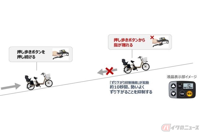 パナソニックサイクルテック株式会社は、子乗せ電動アシスト自転車で押し歩きしなければならないシーンでの負担を軽減するため、手元のスイッチ操作でモーターのアシストが働く「押し歩き機能」を国内で初めて、幼児2人同乗用電動アシスト自転車に搭載して発売します。