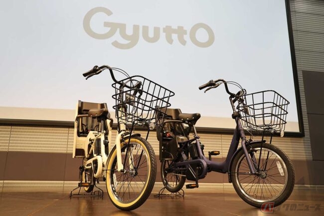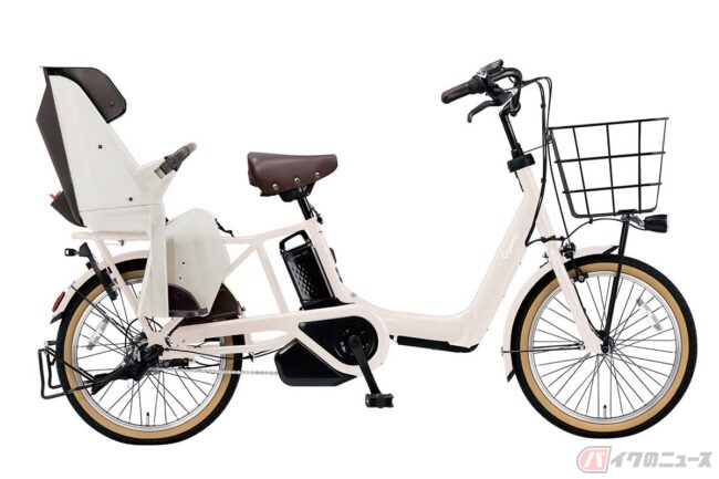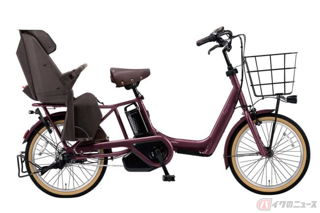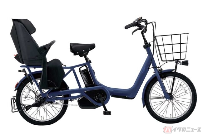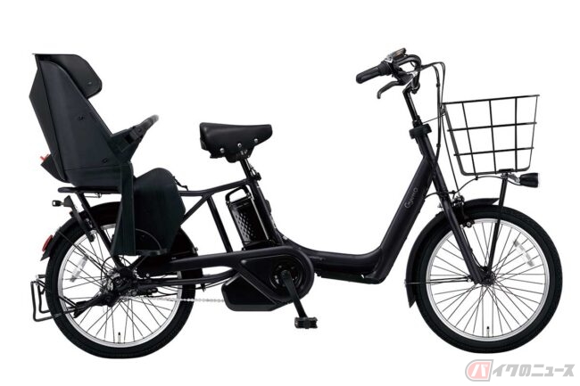 「押し歩き機能」が搭載された新製品「ギュット・アニーズ・DX・押し歩き」は幼児2人同乗用電動アシスト自転車で、タイヤサイズは20、適応身長は155cm以上(幼児2人同乗時)、前かごとリアチャイルドシートを装備し、前用のチャイルドシートはアクセサリーで装着が可能です。
