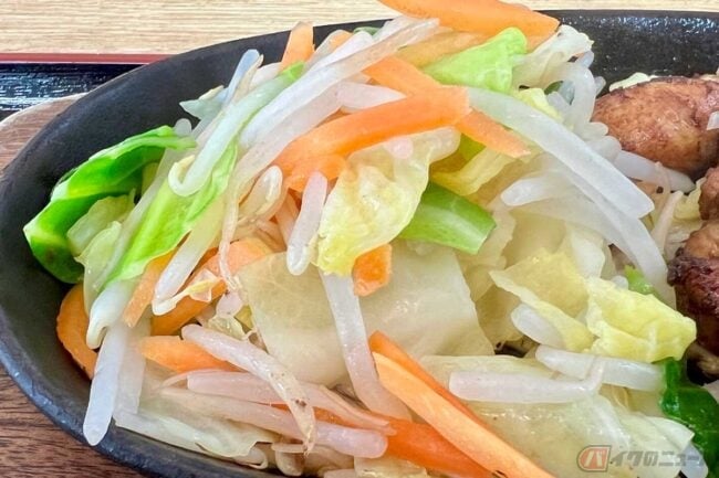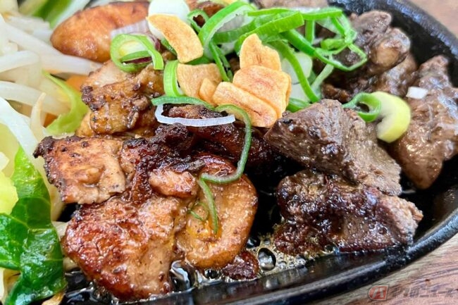 鉄板の上でレバーと鶏肉がジュージューと音を立てている状態で受け取り、席へ戻ります。見た感じはイメージ通りでしたが、野菜の量が多い! 野菜多めの健康志向は、おそらくこの施設のこだわりなのかもしれません。