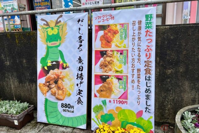 どんな「PA飯」があるのかとフードコート(営業時間:8時~20時)に向かいます。すると建物に入る前から、「だし香る竜田揚げ定食」(880円)や「野菜たっぷり定食」(各1190円)など、様々なメニュー看板が視界に飛び込んで来て少し迷いました。
