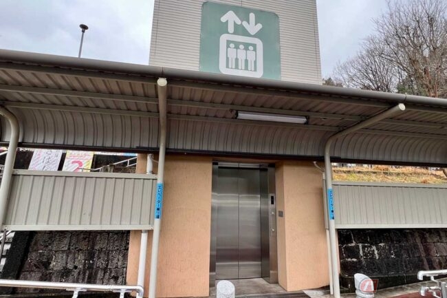 中国自動車道「真庭PA」(上り)は、岡山県真庭市の山間部にあるパーキングエリアです。ツーリング途中に立ち寄ったところ、建物が駐車場よりも高い位置にある、少し変わった施設でした。階段ですぐに上がれる高さではありますが、エレベーターも用意されています。