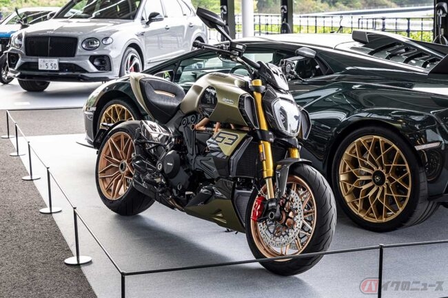 PEC東京のレセプションにはドゥカティの名車が並び、フォルクスワーゲングループであるランボルギーニやベントレーとコラボした限定車も展示され、プレミアムな世界観を演出していました。