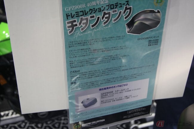 ドレミコレクションは、カワサキ「GPZ900R Ninja」用のチタン素材タンクの市販予定モデルを東京モーターサイクルショーで公開しました。