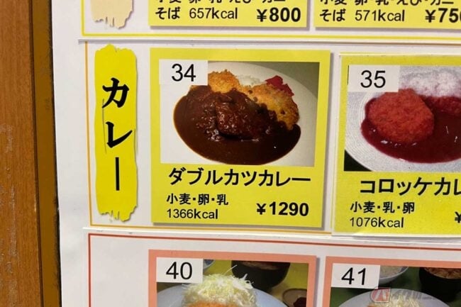 今回はカツカレーが1番人気という「横濱うまいもん亭」で、「ダブルカツカレー」(1290円)をオーダーしました。券売機には1366kcalと記載があり、かなりハイカロリーですがガッツリ食べたい気分だったのです。