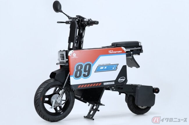 まさにトランスフォーマーのように箱型からバイクへと“変形”する機構が取り入れられたICOMA タタメルバイクでは、大型の四角いサイドパネルを着脱することで、スマホのように気軽にデコレーションを楽しむことができるカスタムパネルも搭載。