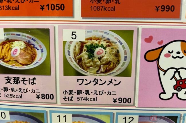 中華そばにワンタンを加えた「ワンタン麺」は、中国の広州で生まれたとも言われ、日本では福岡県の中洲「博多荘」が発祥地ということになっているようです。バイクで東名高速「港北PA」(下り)のフードコートに立ち寄った際に見つけたので食べてみました。